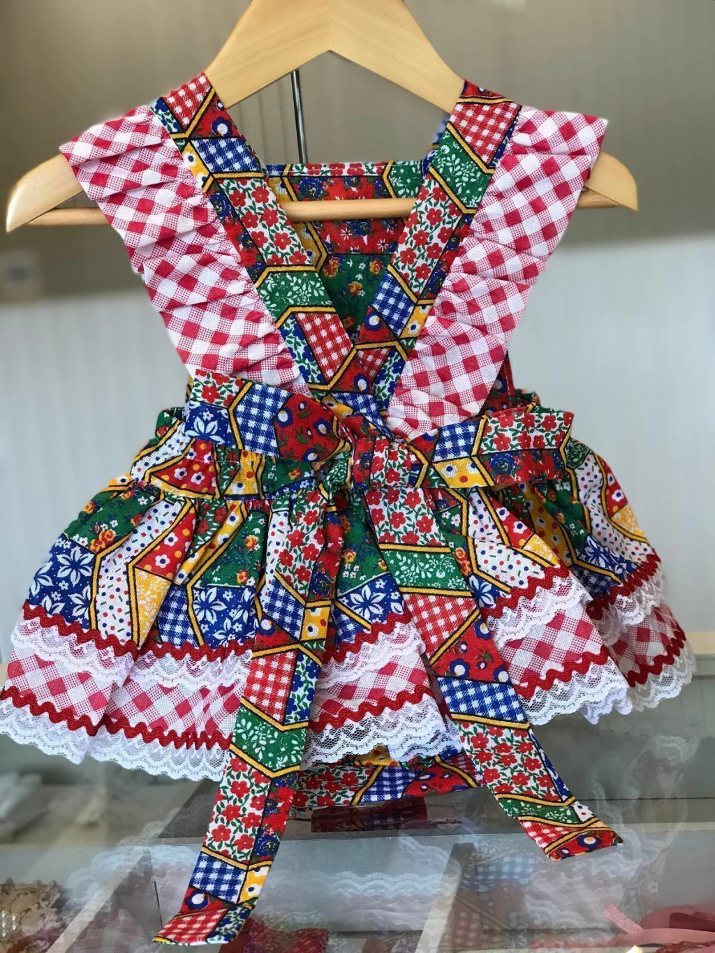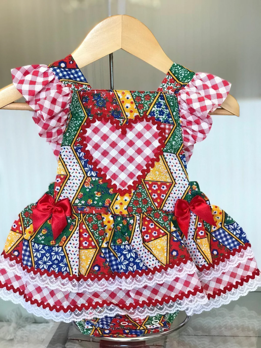 • 01 Jardineira Junina confeccionado em tecido 100% algodão com fechamento em botão e possui regulagem que se adapta ao corpinho da bebê.
