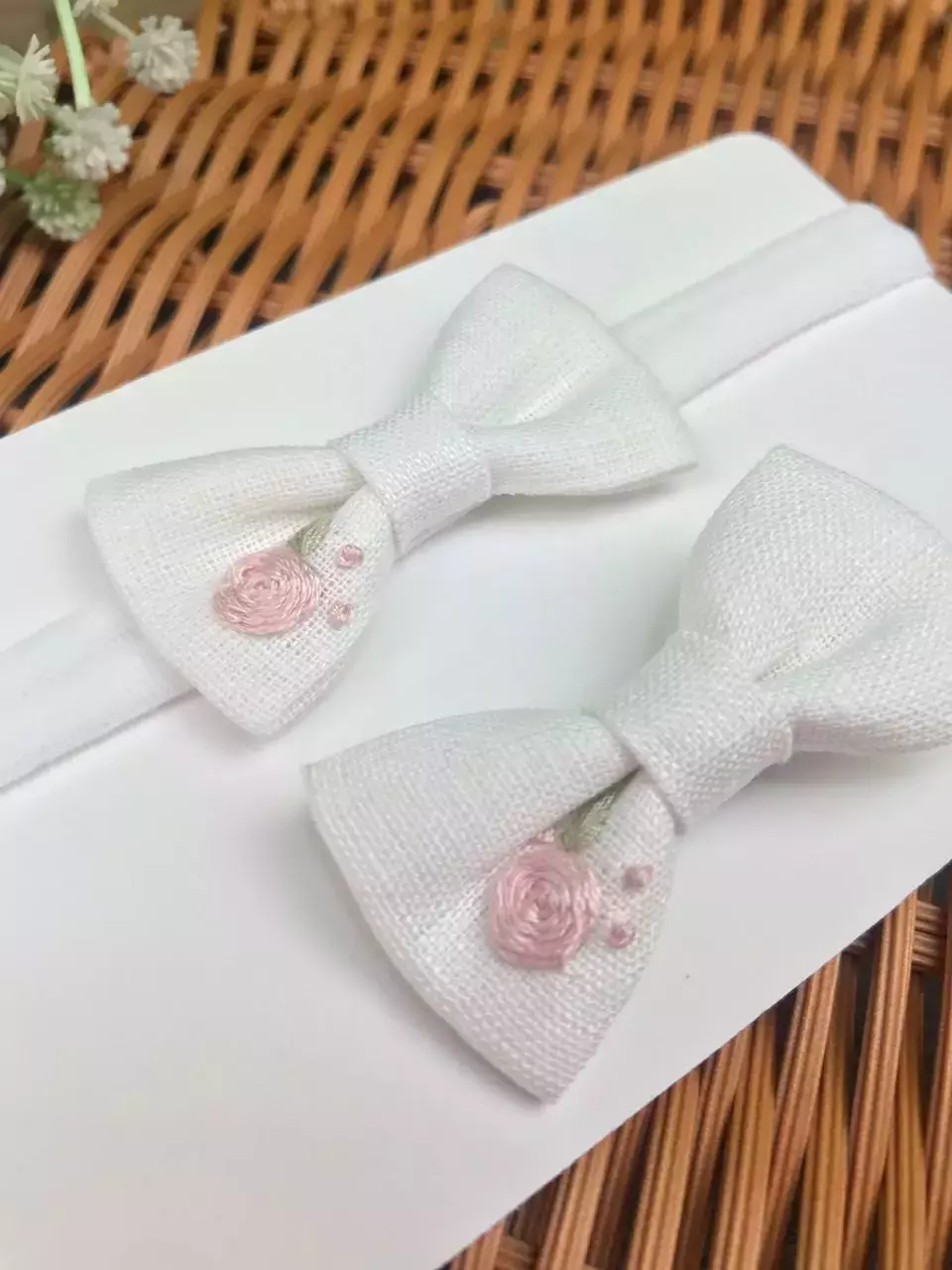 • 01 Laço modelo gravatinha em presilha (bico de pato) ou faixa (meia de seda) feita em tecido cambraia de linho branco, com bordados feitos manualmente., a depender da escolha no ato.